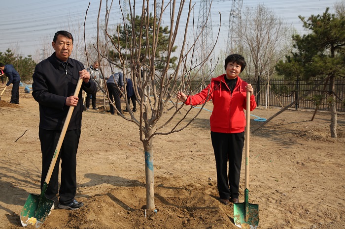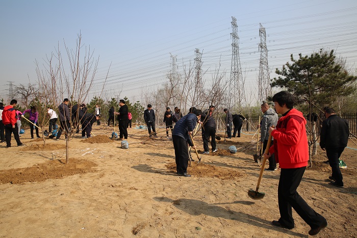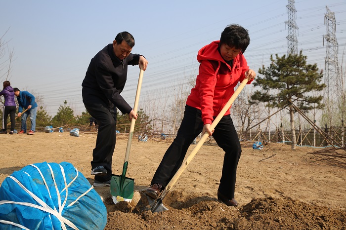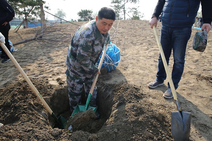 隨后,黨員們分工協(xié)作,三五一組,有的扶苗,有的填土,呈現(xiàn)出一派熱火朝天的勞動(dòng)景象。很快一顆顆新栽種的樹苗迎風(fēng)挺立。近兩個(gè)小時(shí)的時(shí)間84株樹苗整齊的矗立在原本空蕩的土地上。