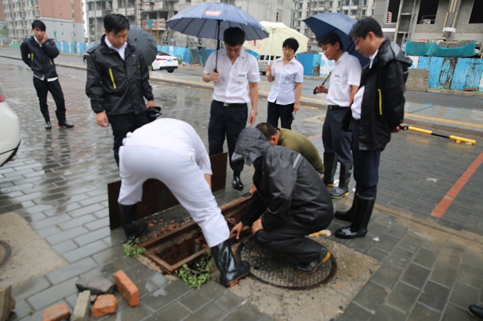 北京市氣象臺(tái)6日9時(shí)5分發(fā)布暴雨藍(lán)色預(yù)警信號(hào),預(yù)計(jì)今天白天到夜間,北京大部地區(qū)將有大雨到暴雨局地大暴雨,永豐農(nóng)工商總公司及相關(guān)二級(jí)公司緊急啟動(dòng)防汛應(yīng)急預(yù)案,總公司總經(jīng)理李建濤、副總經(jīng)理劉迎春帶領(lǐng)永創(chuàng)興業(yè)工程部及盛智豐苑物業(yè)相關(guān)人員到大牛坊安置房小區(qū)檢查防汛部署情況。